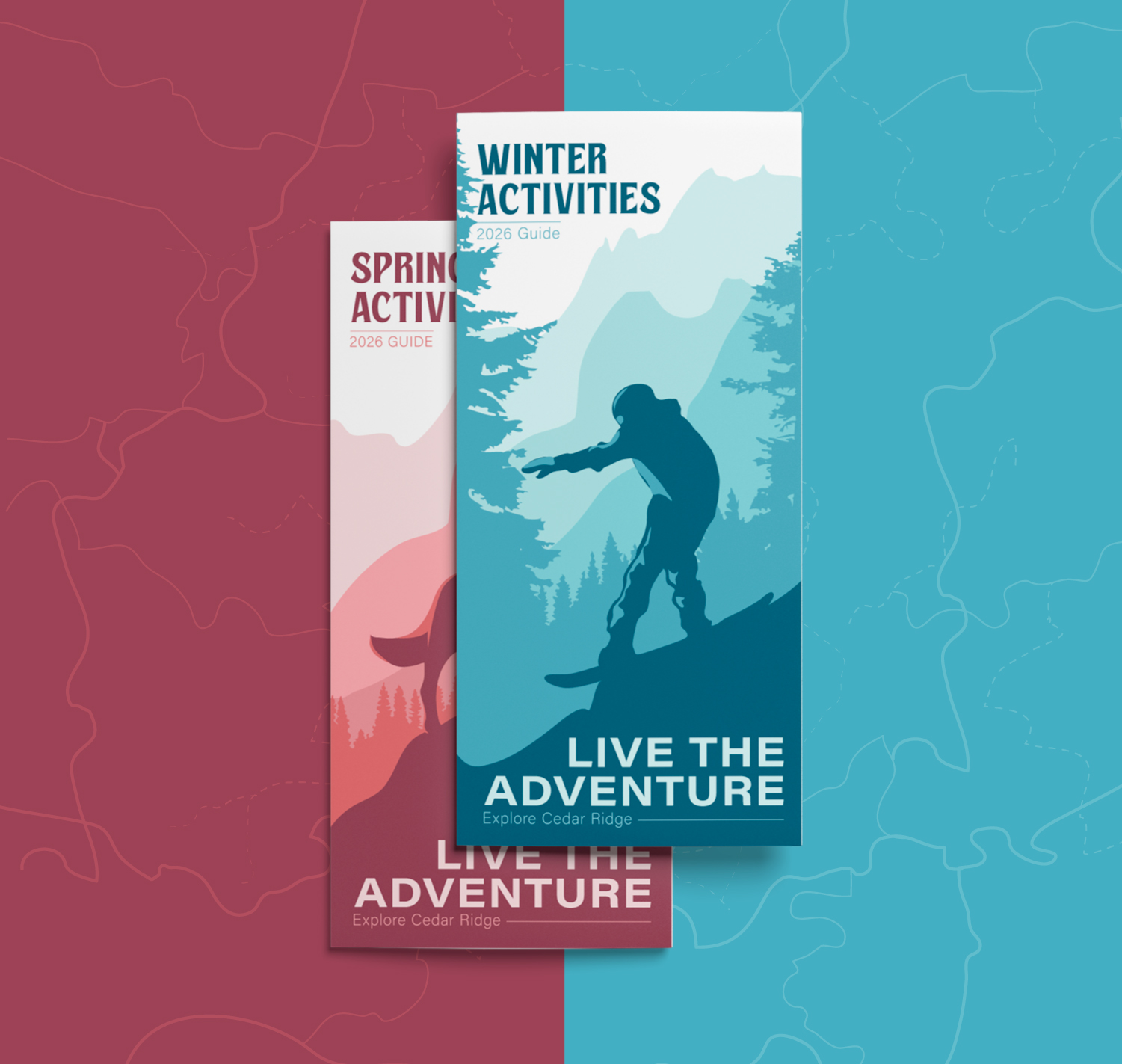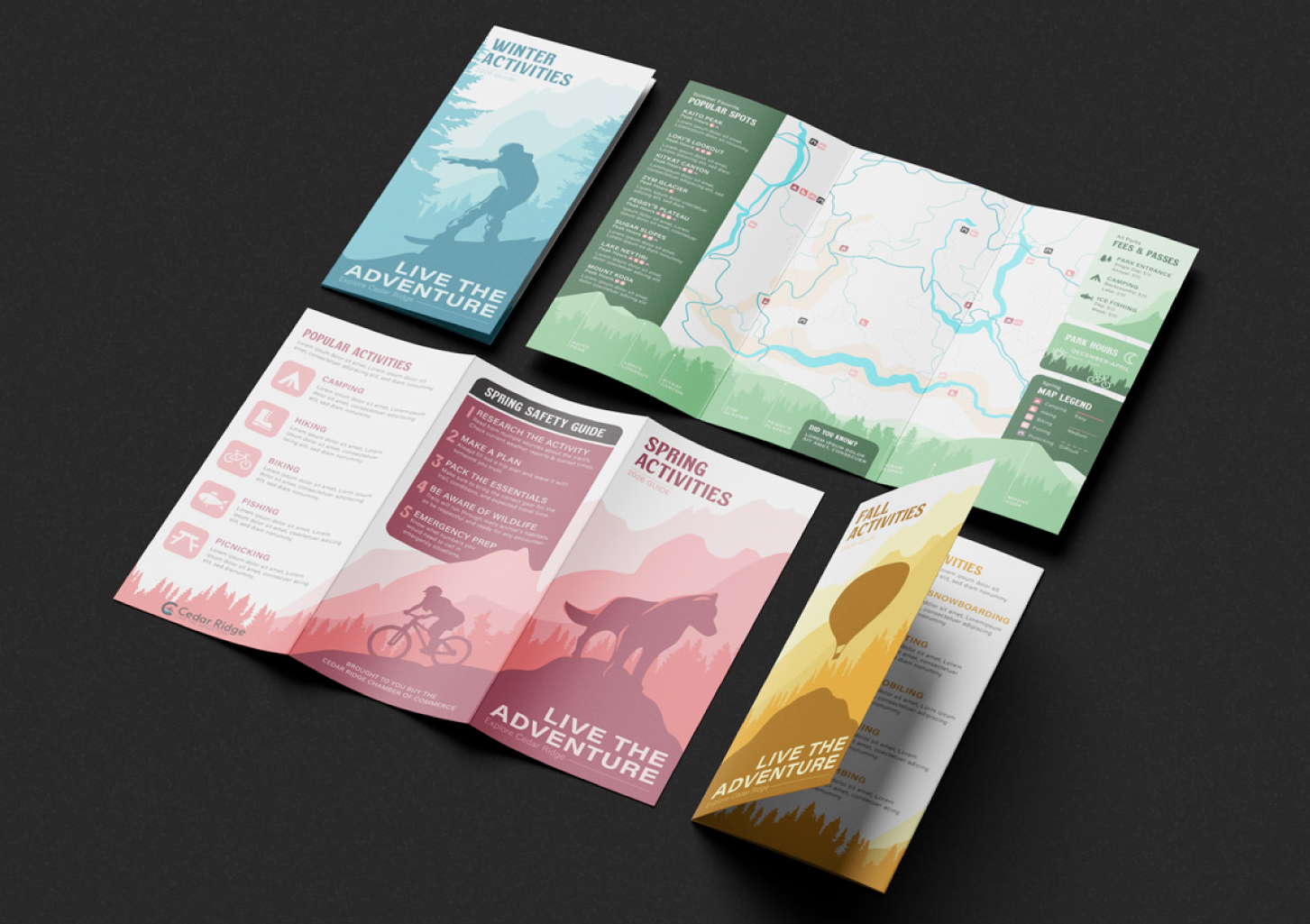 The project also included a suite of print materials designed to showcase how the identity functions in real-world applications, such as brochures, informational pieces, and promotional collateral. Each piece was created to maintain consistency with the core brand while ensuring readability, hierarchy, and visual appeal, demonstrating how the Cedar Ridge identity could scale across both branding and communication needs.